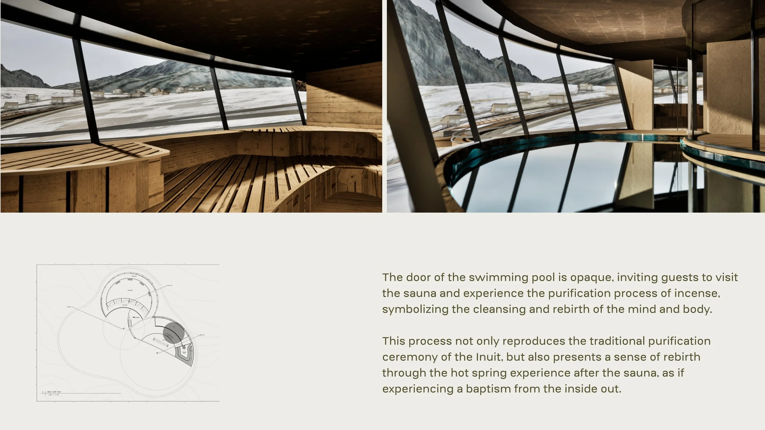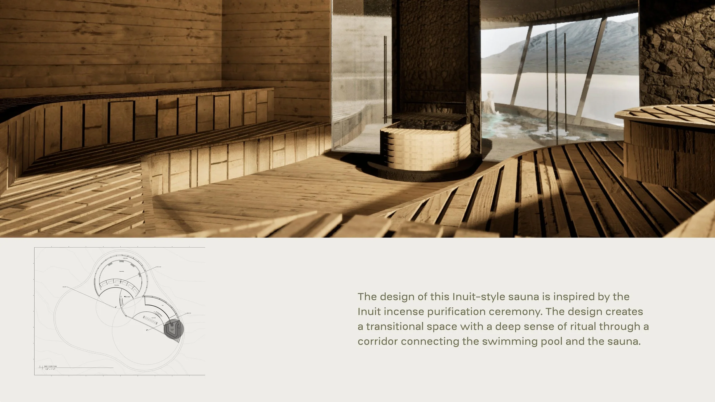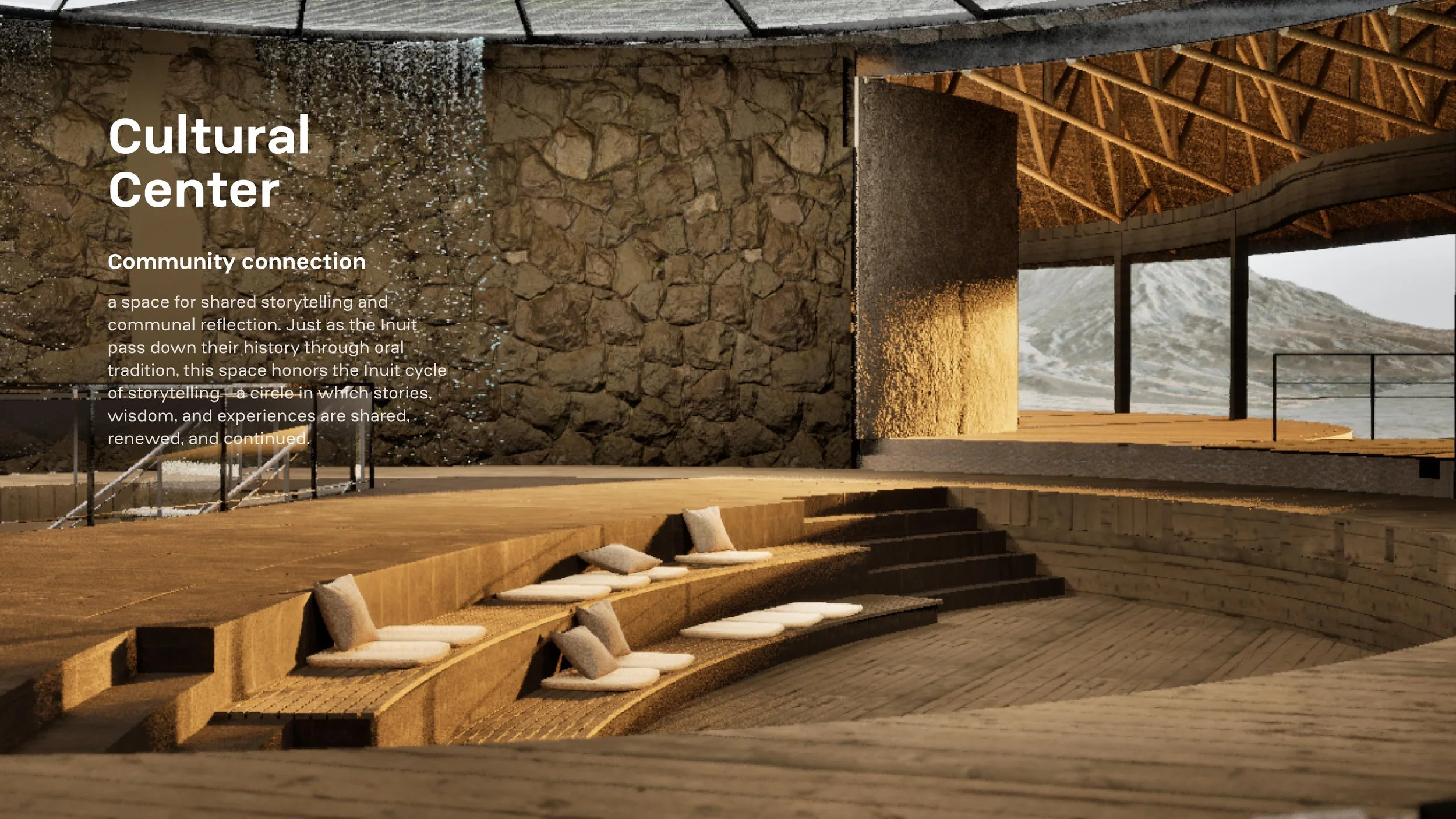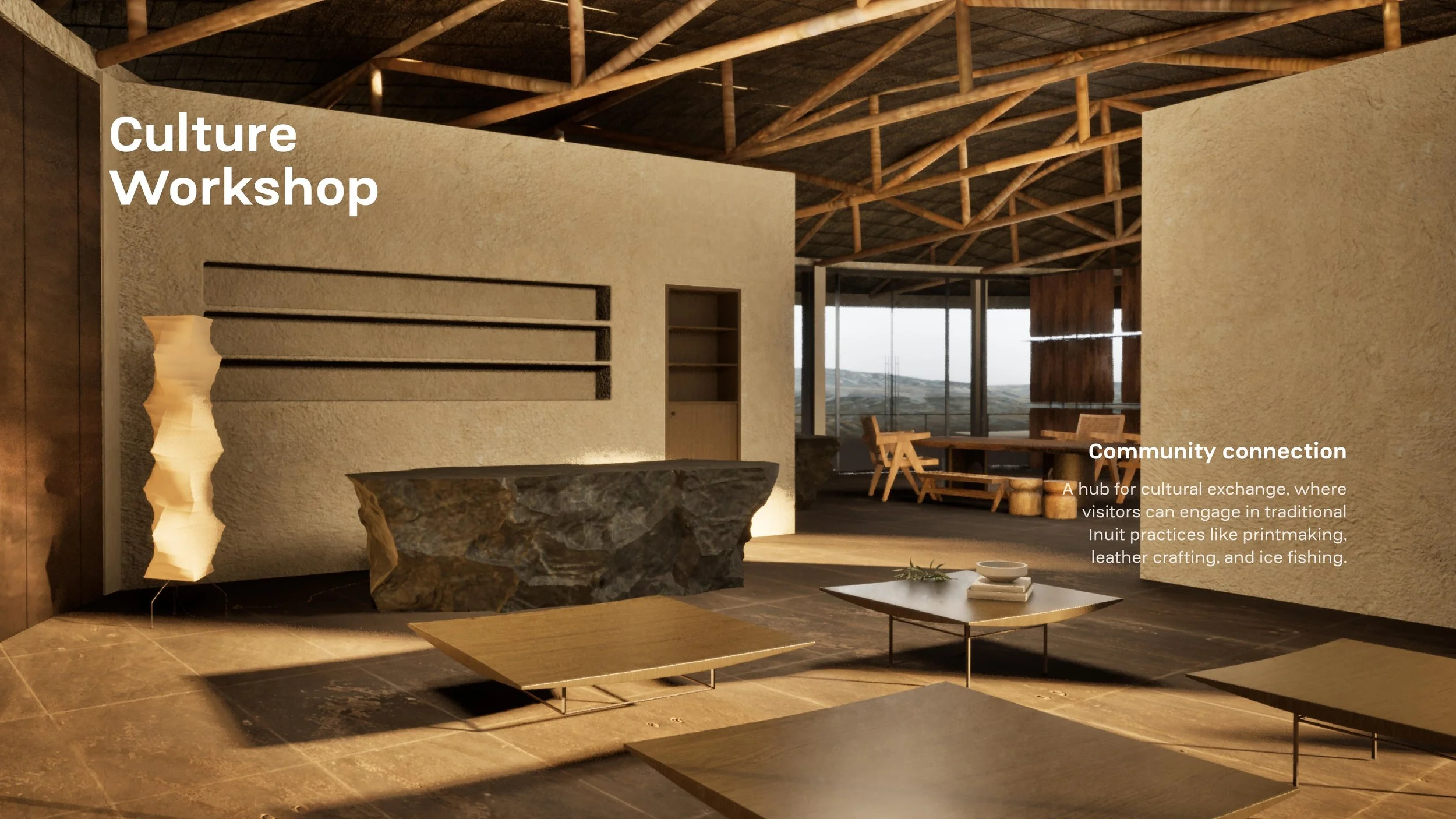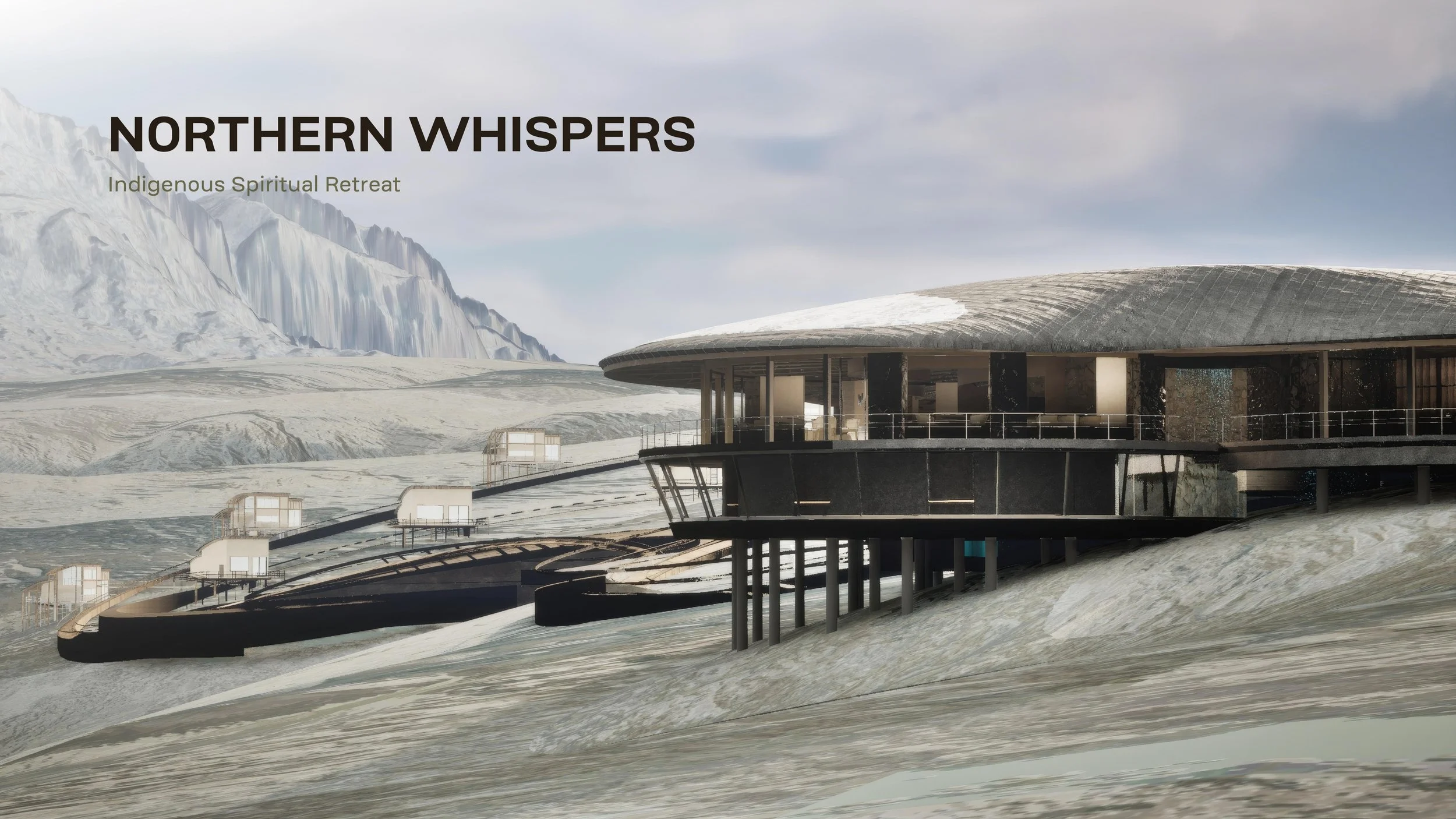 This walkthrough presents Northern Whispers, a hospitality and cultural retreat in Pond Inlet shaped by Inuit wisdom. The design embraces seasonal cycles and the contrasts of the Arctic — guiding visitors from shadow to light, stillness to openness — through spaces built of stone, wood, and natural textures. Here, cultural rituals and wellness experiences intertwine, offering renewal and connection to both people and place.