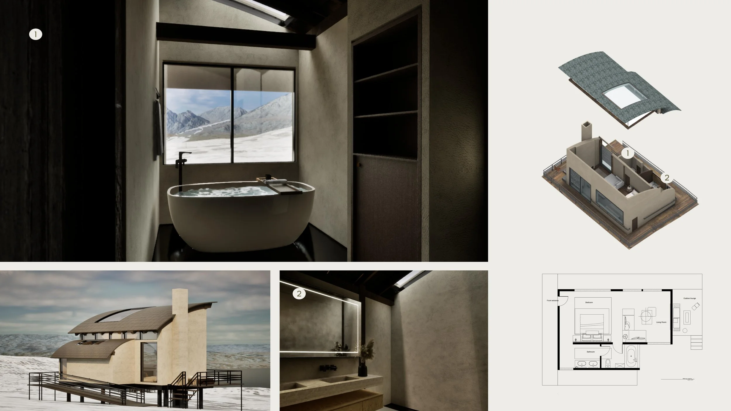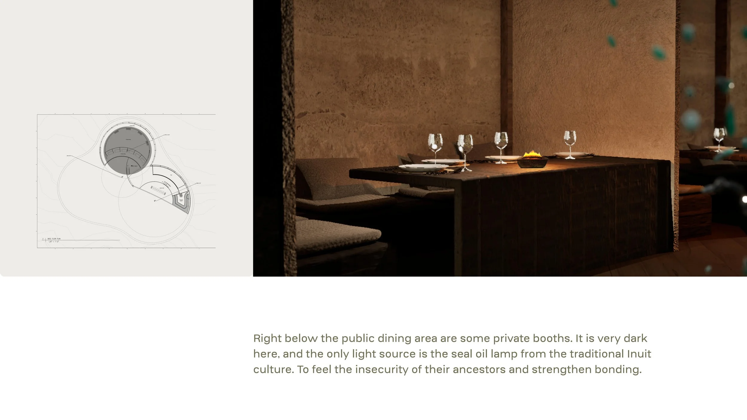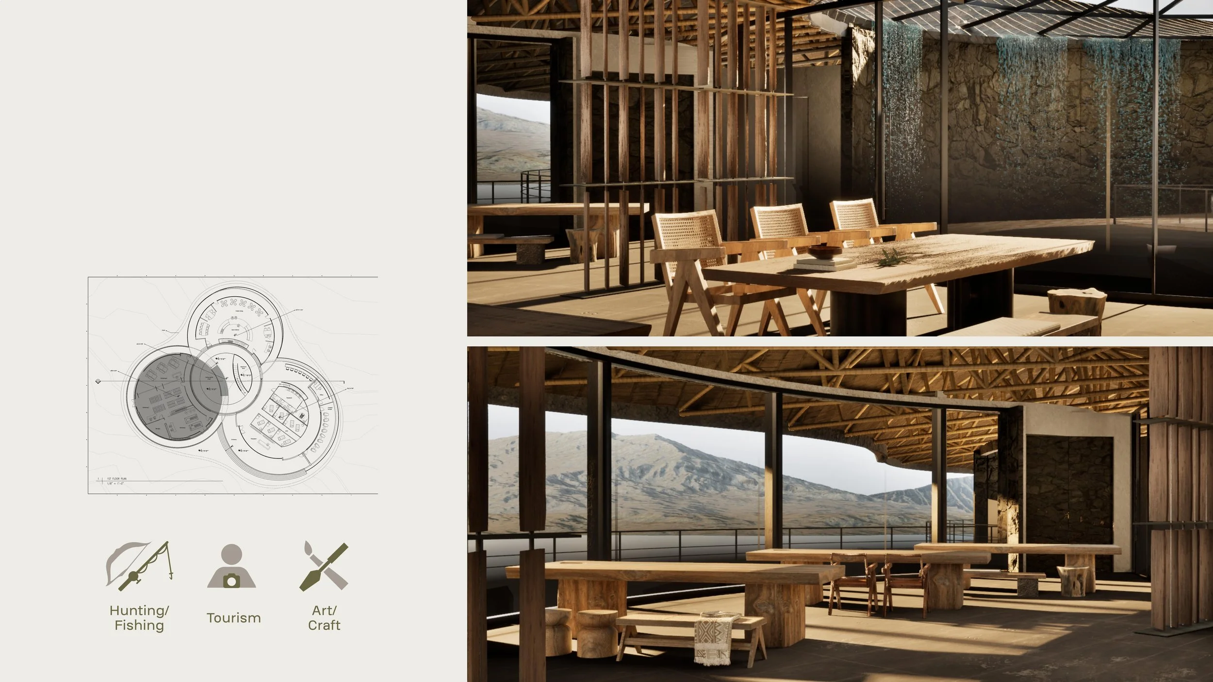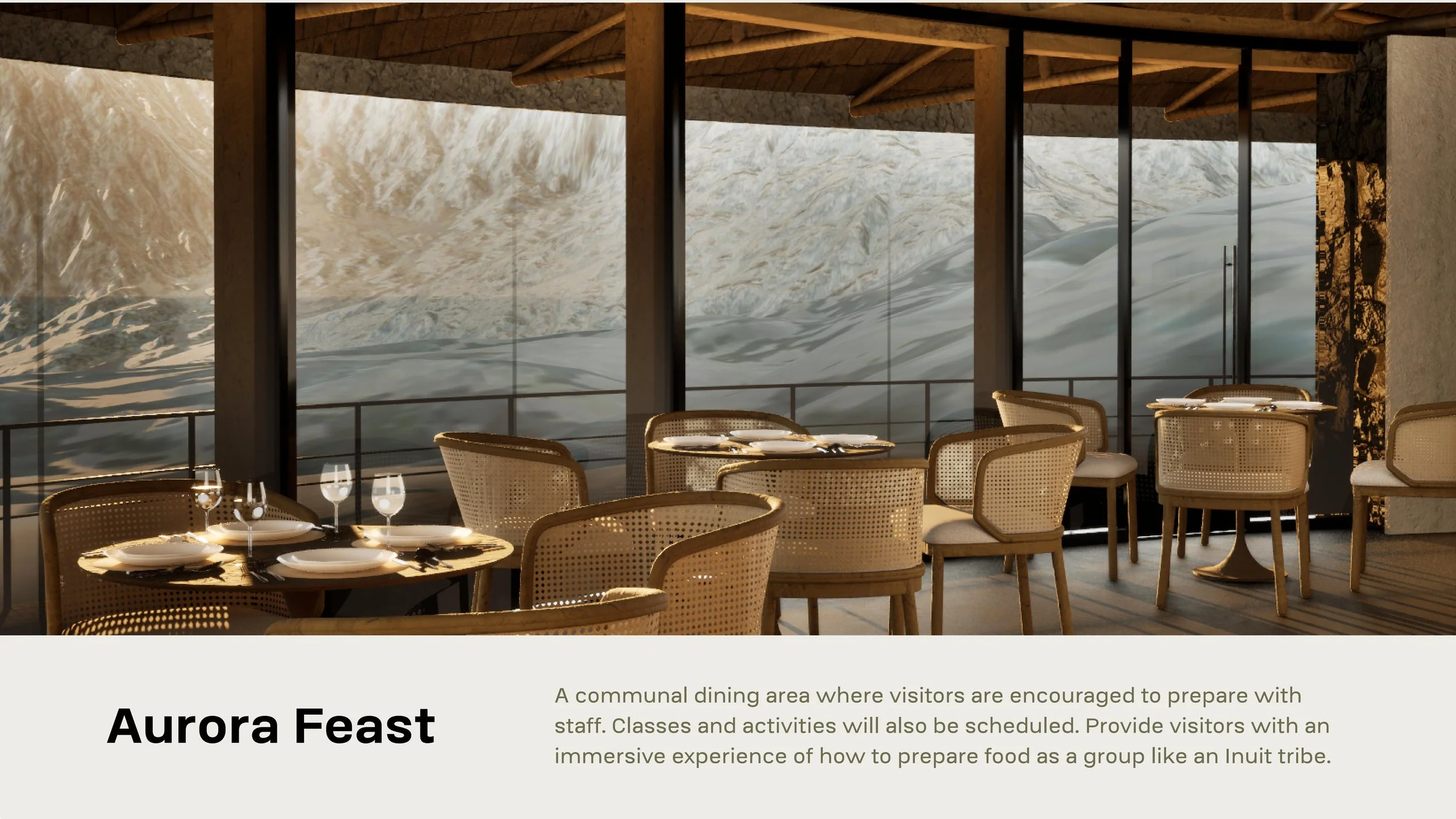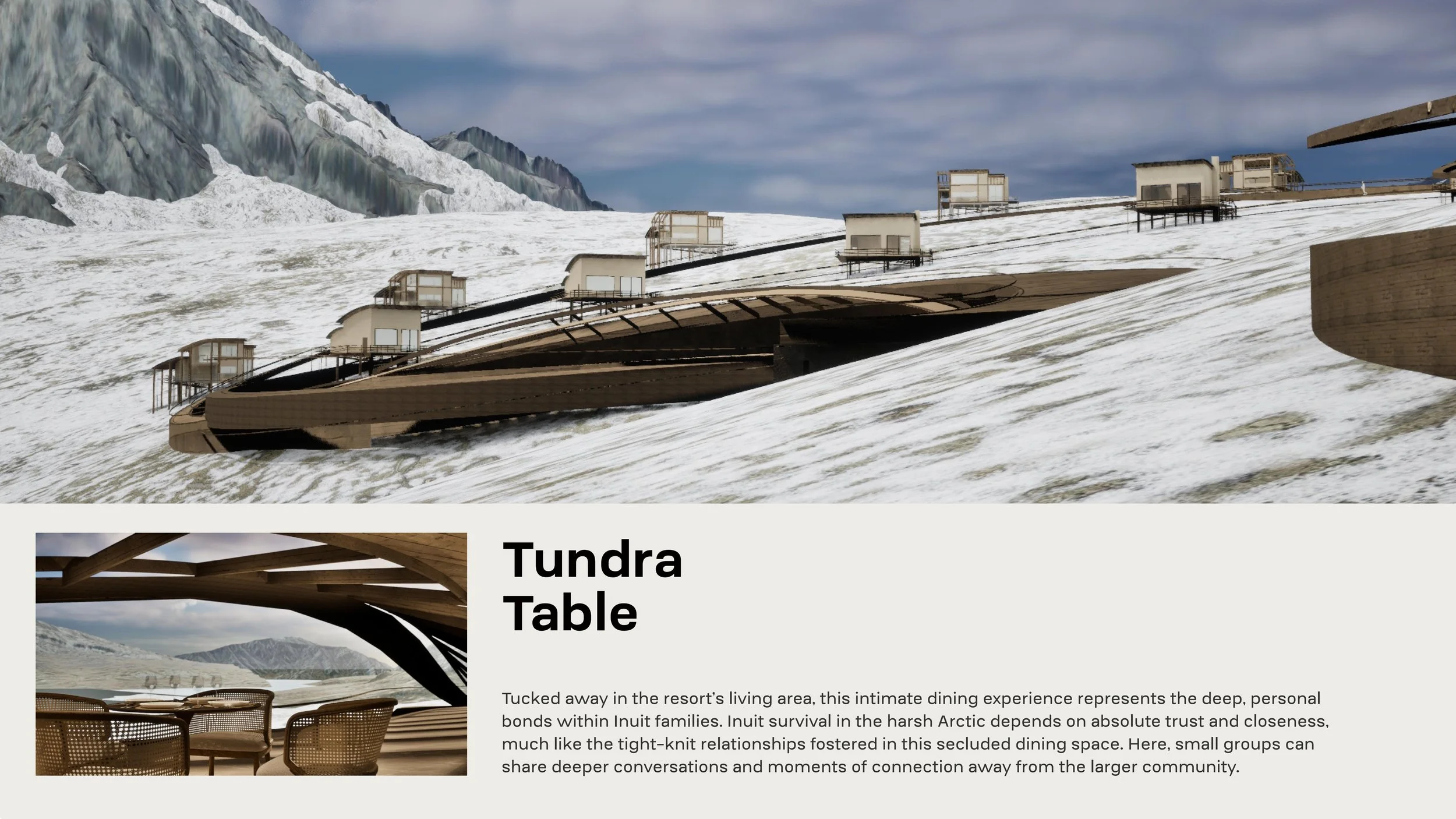 This walkthrough presents Northern Whispers, a hospitality and cultural retreat in Pond Inlet shaped by Inuit wisdom. The design embraces seasonal cycles and the contrasts of the Arctic — guiding visitors from shadow to light, stillness to openness — through spaces built of stone, wood, and natural textures. Here, cultural rituals and wellness experiences intertwine, offering renewal and connection to both people and place.