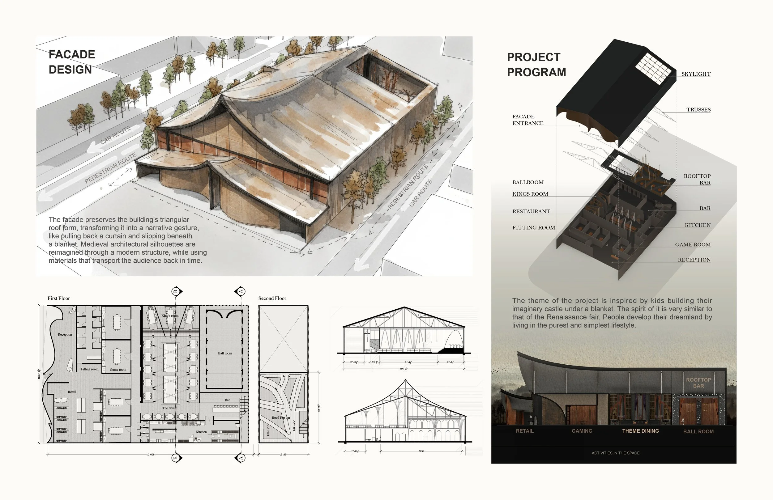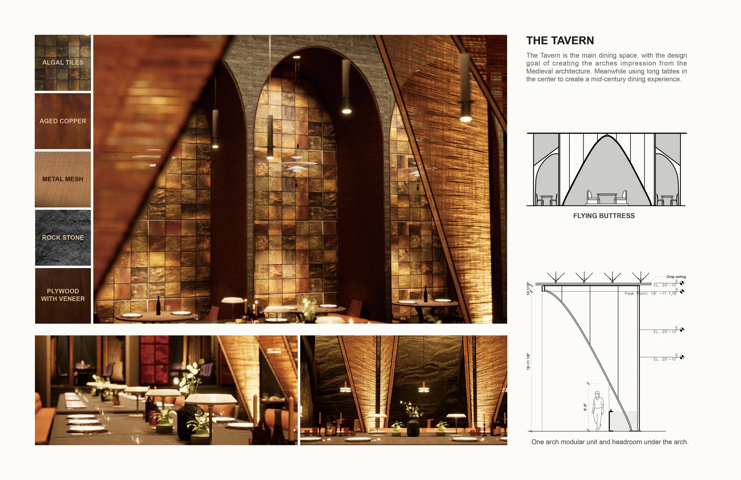 This walkthrough presents Medieval Dining, a concept that reimagines the energy of communal feasts in medieval times. Circulation guides collective movement, and light creates a dramatic atmosphere — together shaping a dining space where ritual, community, and immersion converge.